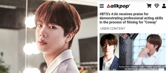 미국 연예 매체 올케이팝(Allkpop)은 최근 "BTS #JIN(진), '코웨이'촬영 현장에서 프로 연기력으로 찬사를 받다"라는 기사를 게재했다.