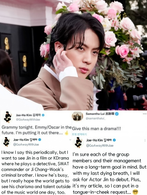 뉴욕 타임스 베스트셀러 작가이자 시카고트리뷴 등에 기고하는 저널리스트 김재하는 "반복해 말하지만 나는 진짜 진이 영화나 K-드라마에 나오는 걸 보고 싶다. 언젠간 음악계 이외에서도 그의 카리스마와 재능을 볼 수 있으면 좋겠다.", "온 마음을 다해 진심으로 진을 배우로 데뷔시켜 달라고 말할 것이다" 라면서 '배우 김석진'에 대한 기대를 수차례 언급했다.
