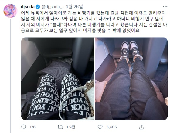 당시 DJ 소다는 SNS에 이 사실을 알리며 "그동안 미국 브랜드에서 선물 받은 이 바지를 입고 수개월 동안 미국 투어를 다니면서 아무런 문제 없이 비행기를 탔다"면서 억울해했다.