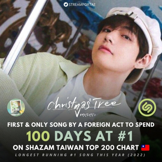 방탄소년단 뷔의 'Christmas Tree'가 샤잠 (Shazam) 대만에서 신기록을 세우며 막강 음원 파워를 자랑했다.