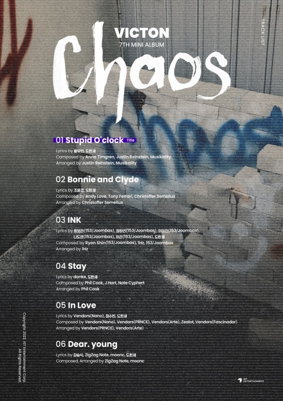 IST엔터테인먼트 측은 9일 밤 11시 빅톤 공식 SNS 채널 등지를 통해 빅톤의 일곱 번째 미니앨범 'Chaos(카오스)'의 트랙리스트 이미지를 공개했다.
