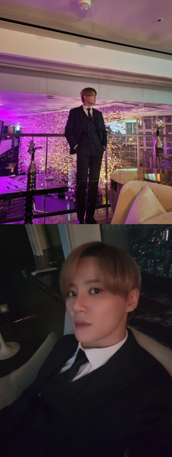 공개된 사진 속 김준수는 검정 슈트를 입고 포즈를 취하고 있다. 다른 사진에는 무표정으로 셀카를 찍고 있다.