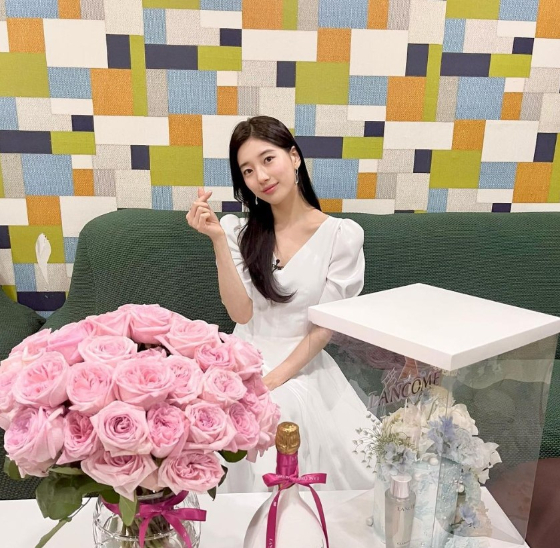 공개된 사진 속 수지는 흰색 드레스를 입고 머리칼을 한쪽으로 모아 내려뜨린 채 하트 제스처를 취하고 있다. 핑크 장미꽃과 케이크가 떡하니 있음에도 수지의 아름다운 외모가 시선을 사로 잡았다.