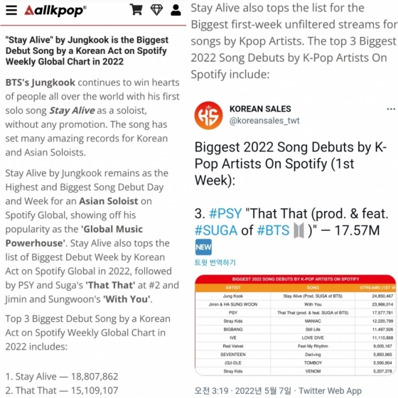 지난 2월 11일 발매된 정국의 'Stay Alive'는 2022년 스포티파이 글로벌 주간 차트에 가장 성공적인 데뷔를 기록한 한국 가수의 곡 1위를 차지했다.