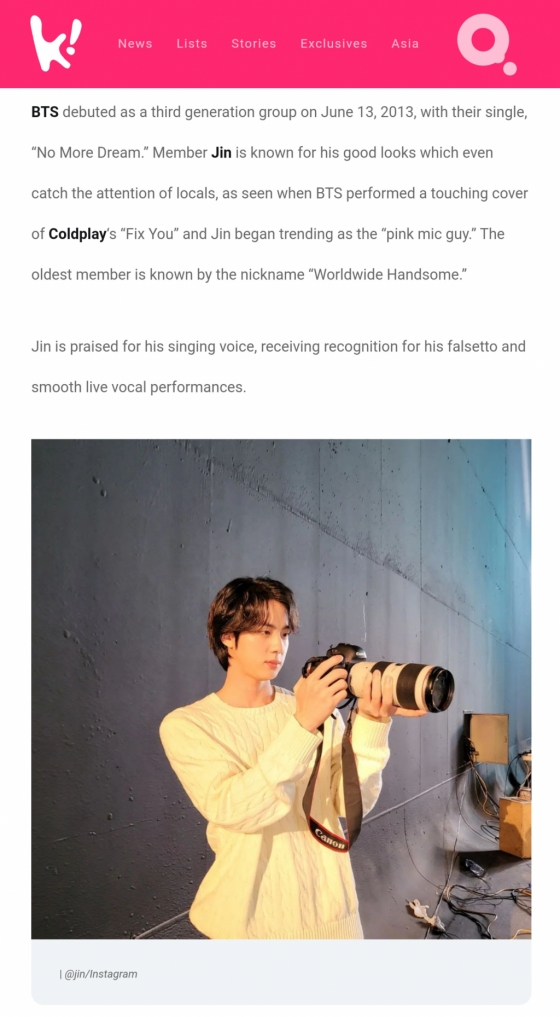 매체는 방탄소년단이 콜드플레이(Coldplay)의 '픽스 유(Fix You)'를 감동적인 커버로 장식한 후 멤버 진이 '핑크 마이크 가이'로 트렌딩되는 등 그는 현지인들의 시선을 사로잡을 정도로 너무나 잘생긴 외모로 알려져 있다고 전했다.