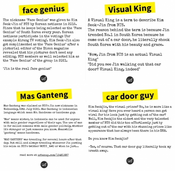 어반 딕셔너리는 진의 비주얼에 대해 '얼굴 천재' 외에도 '비주얼 킹'(Visual King)', 'car door guy'(차문남), 'Mas Ganteng'(마스 간떵) 등 여러가지 키워드로 정의하며 진이 압도적인 아름다움을 가진 '비주얼의 황제'로 통하고 있음을 증명했다.