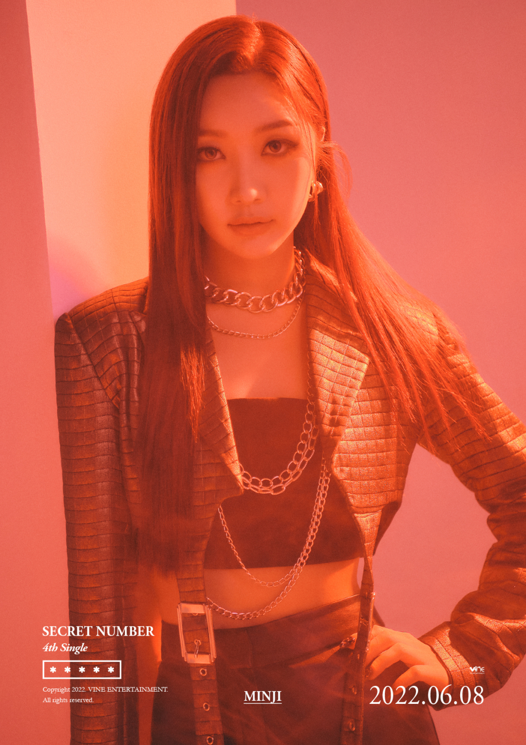 민지는 가죽 소재의 의상과 체인 액세서리로 와일드한 매력을 발산했다. 민지의 강렬한 눈빛이 시크릿넘버가 이번 신곡에서 새롭게 보여줄 음악과 콘셉트에 대한 궁금증을 높이고 있다.
