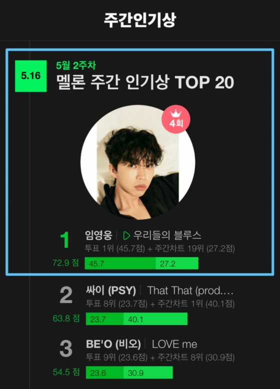 임영웅은 5월 2주차 멜론 주간 인기상 TOP20에서 정규 1집 'IM HERO' 선공개곡이자 수록곡 '우리들의 블루스'로 1위를 차지했다.