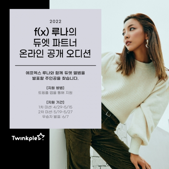 20일 오전 트윙플 측은 "걸그룹 f(x)의 메인보컬이자 뮤지컬 배우로 활발히 활동하고 있는 루나와 함께하는 데뷔 챌린지가 많은 참여자들의 지원으로 조기 마감됐다"고 밝혔다.
