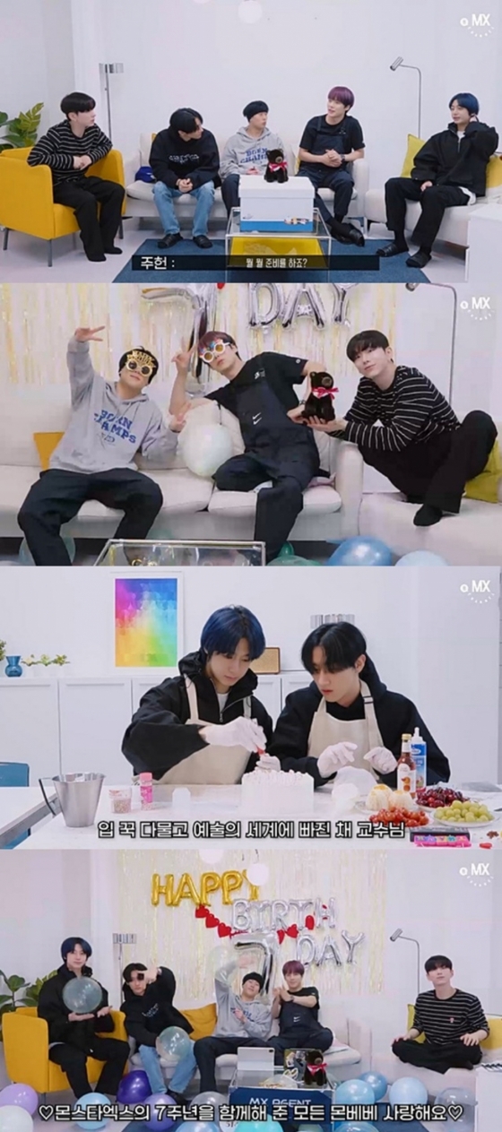 작업을 마치고 한 자리에 모인 몬스타엑스는 "값을 매길 수 없는 케이크와 파티룸을 만들었다"라며 라이브 방송을 향한 기대감을 내비쳤다. 끝으로 "7주년을 만들어준 몬베베(팬덤명) 축하한다"라고 팬들에게 고마운 마음을 드러냈다.