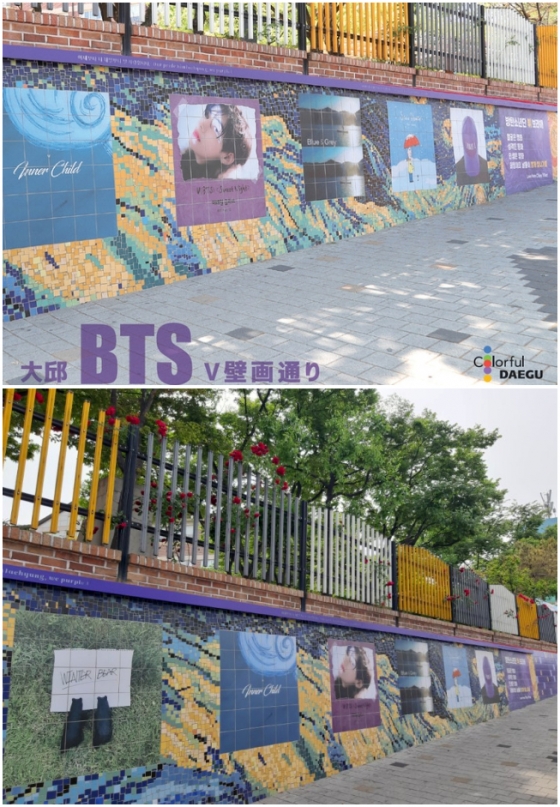 방탄소년단(BTS) 뷔의 모교에 설치된 파노라마 벽화가 연장 조성사업을 끝내고 총 길이 58m의 초대형 벽화거리로 재탄생, 글로벌 관광명소로 발돋움하고 있다.