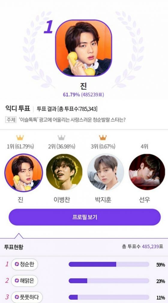 진의 매력으로는 '청순한'이 1위에 꼽혔으며 이어 '해맑은', '풋풋하다' 순이었다.