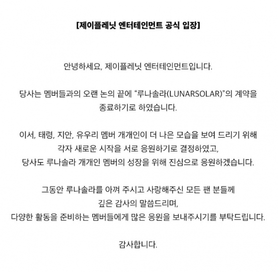 소속사 제이플래닛엔터테인먼트는 지난 22일 공식 SNS를 통해 공식입장을 전하고 "루나솔라 멤버들과의 오랜 논의 끝에 계약을 종료하기로 했다"라며 "이서, 태령, 지안, 유우리 멤버 개개인이 더 나은 모습을 보여 드리기 위해 각자 새로운 시작을 서로 응원하기로 결정했다"라고 밝혔다.