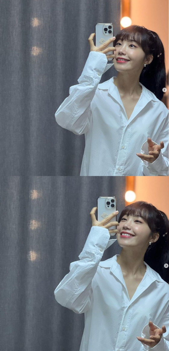 공개된 사진 속 정은지는 흰색 셔츠를 입고 미소를 띤 채 거울 셀카를 찍고 있다. 올림머리를 한 정은지의 귀여운 눈웃음과 기이한 형태의 손가락 모양이 눈길을 끈다.