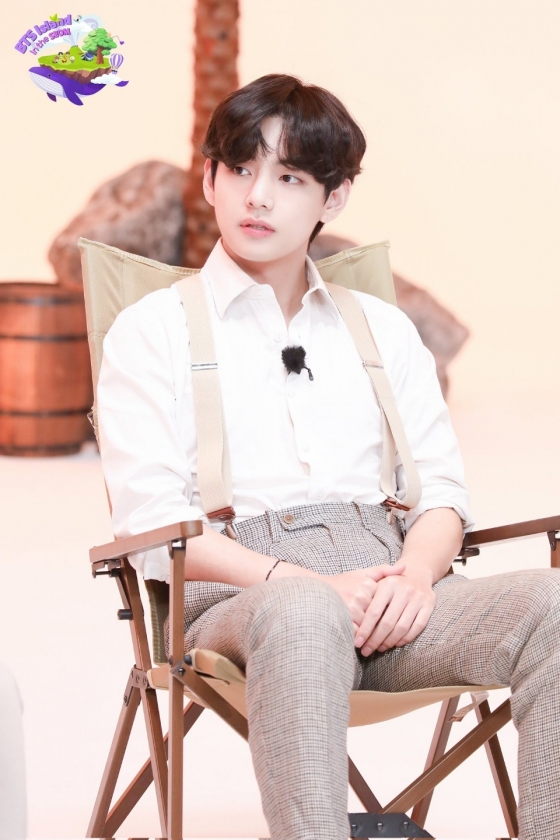 뷔는 자연스럽게 앞머리를 내린 짙은 브라운 헤어스타일에 하얀 와이셔츠와 체크무늬 바지를 입고 서스펜더를 착용해 댄디하면서도 사랑스러운 모습으로 시선을 모았다.