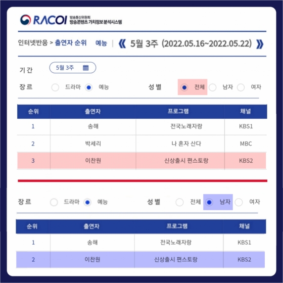 이찬원은 RACOI(방송통신위원회 방송콘텐츠 가치정보 분석 시스템) 5월 3주(5월 16일~5월 22일) 순위에서 KBS 2TV '신상출시 편스토랑'으로 예능 전체 출연자 톱3를 기록했다. 남성 출연자 중에는 톱2 기록이다.