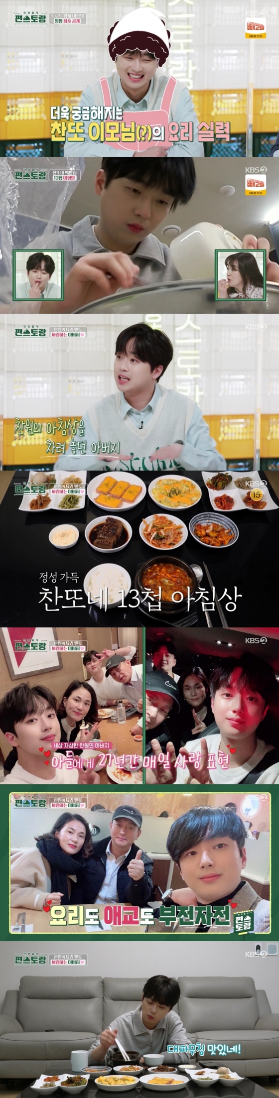 이찬원은 지난 5월 6일 방송부터 '편스토랑'에 합류, 깔끔한 살림 솜씨와 정갈한 손맛으로 '최강 자취남' 면모를 빛냈다. 이찬원은 아침부터 살뜰히 지인들에게 안부전화를 하고, 13첩 반상으로 조식을 준비하는 등 야무진 모습으로 시청자들의 눈길을 사로잡았다.