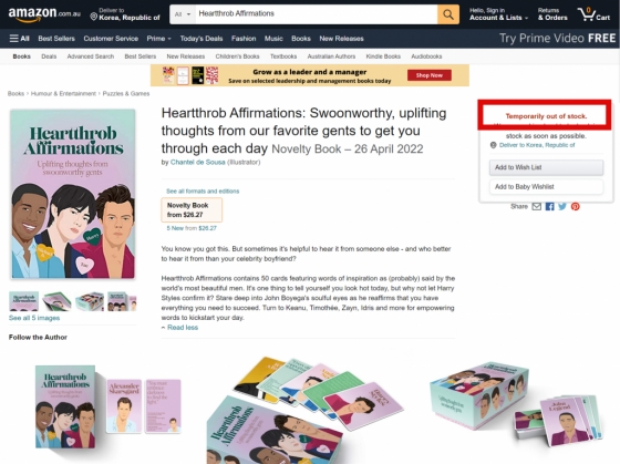 세계최대 전자상거래 플랫폼 아마존을 통해서 판매되고 있는 이 책은 품절사태를 이어오고 있으며 현재도 입고를 기다리고 있다.