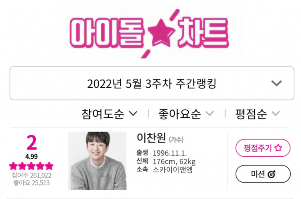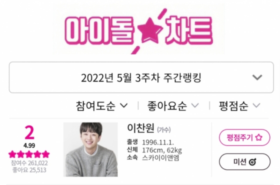 이찬원은 5월 3주차 아이돌차트 평점랭킹에서 26만 1022표를 받아 전체 2위를 차지했다.