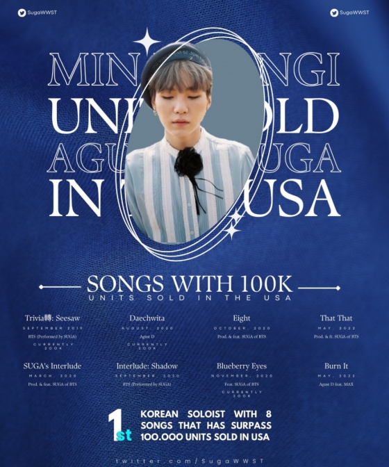 톱 아이돌그룹 방탄소년단(BTS, RM 진 지민 제이홉 슈가 뷔 정국) 멤버 슈가가 미국 판매량 10만장을 돌파한 8곡을 가진 유일한 한국 솔로 가수가 됐다.