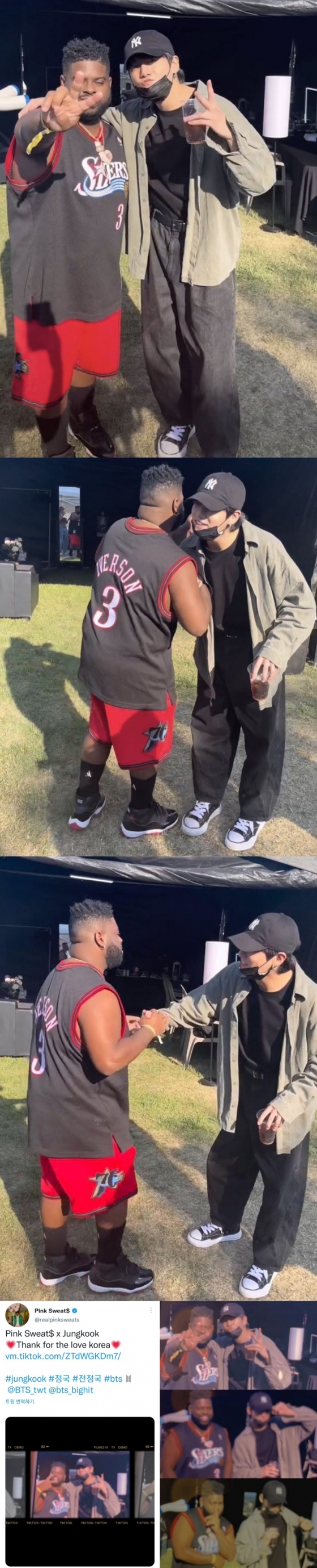 방탄소년단(BTS) 정국이 첫 내한한 미국 싱어송라이터 핑크 스웨츠(Pink Sweat$)와 만난 소식이 전해져 눈길을 모은다.