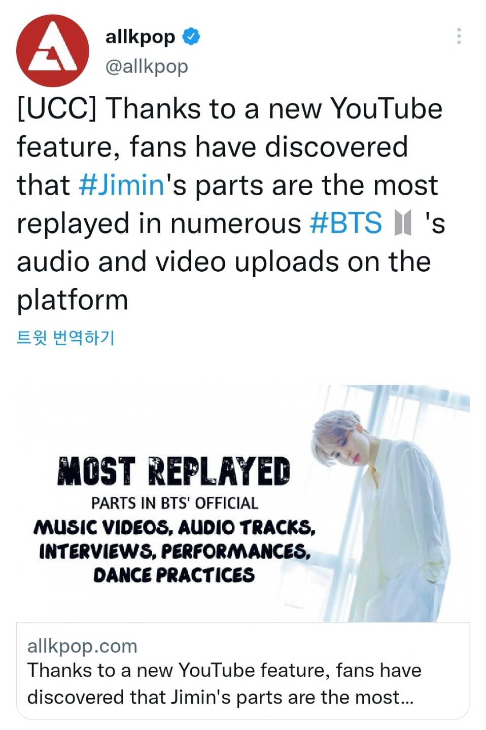 미국 한류 매체 올케이팝(Allkpop)은 최근 유튜브(YouTube)영상에서 가장 많이 재생된 부분을 이용자들이 확인할 수 있도록 기능을 새롭게 선보인 것과 관련해 "다수의 방탄소년단 공식 뮤직비디오와 음원을 분석한 결과, 지민의 파트가 가장 많이 재생된 것으로 나타났다"고 보도했다.