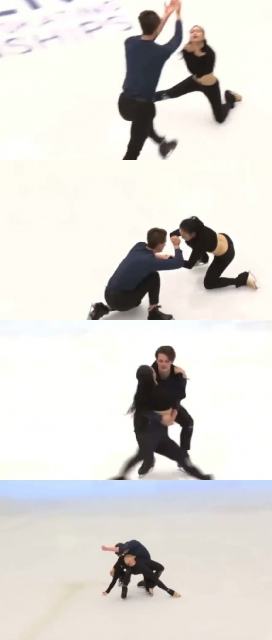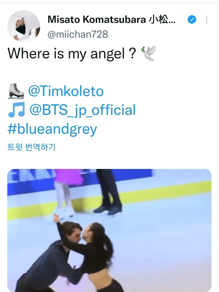 5일 일본의 피겨 스케이팅 아이스댄스 선수 코마츠바라 미사토(小松原美里)가 공식 트위터 계정에 파트너이자 남편인 팀 콜레토(Tim Koleto)와 함께 '블루 앤 그레이'에 맞춰 연습하는 영상을 올려 화제가 되고 있다.