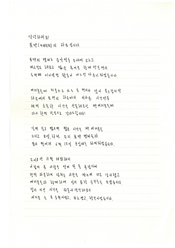 하은은 "포맨의 멤버로 음악방송 무대에 오르고 버스킹도 해보고 많은 추억을 함께 만들면서 두 번째 미니앨범 활동이 어느덧 마무리되었다"라며 "여러분들께 처음으로 쓰는 손편지라 많이 쑥스럽지만 하은에서 포맨의 하은까지 지나온 시간만큼 제게 소중한 시간을 선물해주신 팬 여러분들께 다시 한번 진심으로 감사드린다"고 밝혔다.