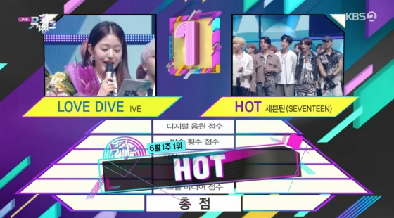 이날 후보로는 아이브 'LOVE DIVE', 세븐틴 'HOT'이 나란히 1위 후보에 올랐다.