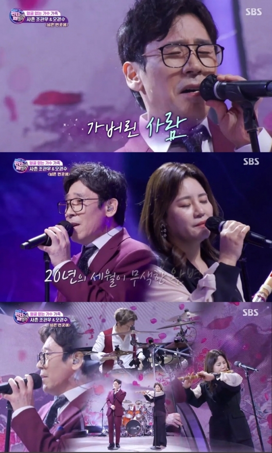 조관우는 지난 2일 방송된 '판타스틱 패밀리'에서 'DNA 싱어'로 출연한 사촌동생 오경수와 함께 무대를 꾸몄다. 36년째 대금을 연주하고 있는 오경수는 무형 문화재 44호 삼현육각 여자 최초 이수자다. 조관우와 오경수는 국악을 접목시킨 '님은 먼 곳에' 무대를 선보였다. 오경수의 남편인 조용필과 위대한 탄생의 드러머 김선중도 현란한 드럼 연주로 무대를 지원사격했다. 비록 우승은 하지 못했지만 판정단 99명 중 80명의 선택을 받은 인상적인 무대였다.