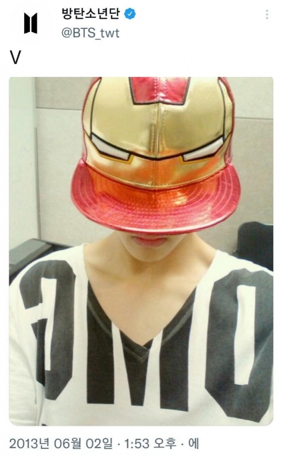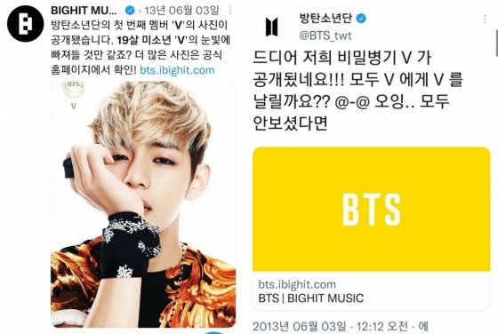 뷔는 지난 2013년 6월 2일 방탄소년단 공식 트위터에 'V'라는 한 글자와 모자를 눌러쓴 사진을 올려 자신의 존재를 처음 알리면서, 방탄소년단 멤버가 6인이 아닌 7인이라는 사실도 밝혀져 놀라움을 안겼다.