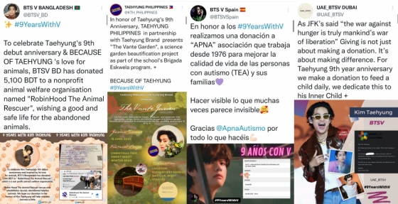 스페인 팬베이스 'BTS V Spain'는 자폐증 환자와 그 가족들을 돕는 단체 'APNA'에 기부, 'UAE_BTSV'는 어린이에게 식사를 제공하는 단체에 기부금을 전달, 필리핀의 'TAEHYUNG PHILIPPINES'는 학교의 정원 미화프로젝트 일환으로 The Vante Garden(반테가든)을 만들고 뷔의 자작곡 Christmas Tree, Sweet Night, Winter Bear의 이름을 딴 벤치를 기부, 'BTS V BANGLADESH'는 비영리 동물보호단체 '로빈후드 동물구조원'에 기부금을 전달했다.