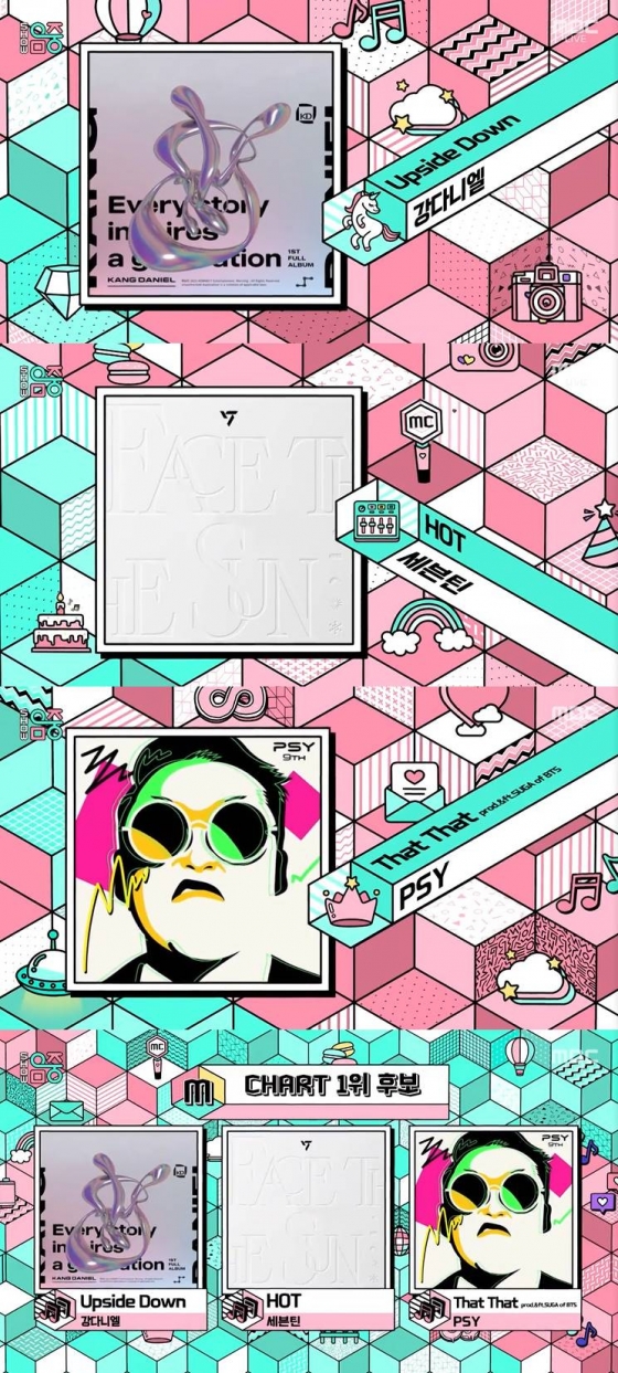 강다니엘은 'Upside Down', 세븐틴은 'HOT', 싸이는 'That That'으로 1위를 노린다.