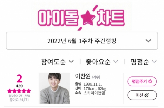 이찬원은 6월 1주차 아이돌차트 평점랭킹에서 25만 1550표를 받아 전체 2위를 차지했다.