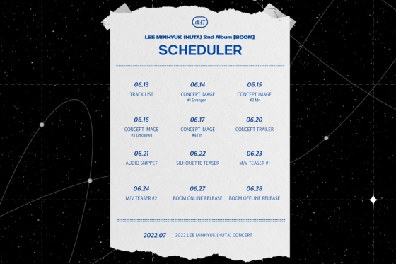 공개된 스케줄러에 따르면 이민혁(HUTA)은 트랙리스트를 시작으로 콘셉트 이미지, 콘셉트 트레일러, 오디오 스니펫, 뮤직비디오 티저 영상 등 신보와 관련된 다채로운 티징 콘텐츠를 차례로 오픈한다.