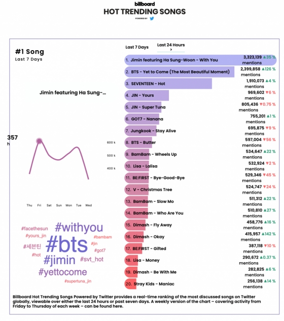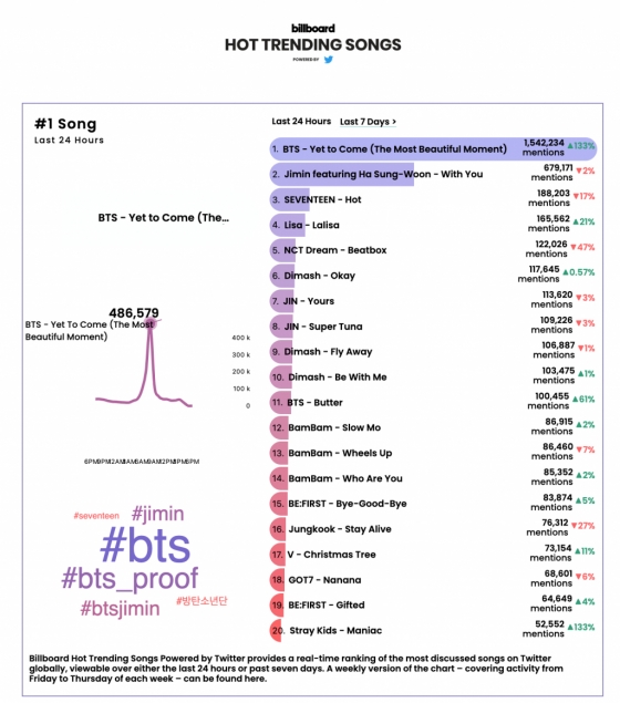 리얼타임 차트에서는 오는 10일 컴백하는 방탄소년단 새 앨범 'Proof' 타이틀 곡 'Yet to Come'(The Most Beautiful Moment)가 압도적인 트윗으로 1위를 기록하고 있고 방탄소년단 멤버 지민의 첫 OST 'With You'가 2위, 세븐틴 'Hot'이 3위, 블랙핑크 멤버 리사 솔로곡 'Lalisa'가 4위, NCT DREAM 'Beatbox'가 5위를 차지하며 톱5를 K팝 가수들이 장악했다.
