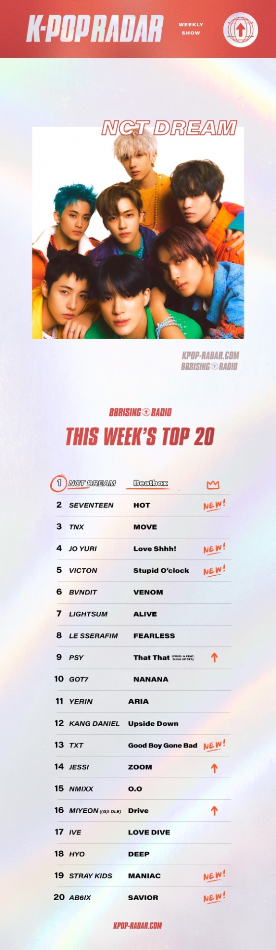 '케이팝레이더'에서 공개되는 케이팝레이더 위클리 트렌딩 차트는 88라이징 라디오 및 케이팝레이더 SNS에서 확인할 수 있다.