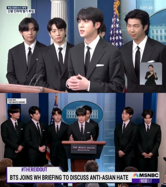 진은 "오늘은 'AANHPI Heritage Month(아시아계 미국인 및 하와이·태평양 도서 원주민 유산의 달)'의 마지막 날이다. 저희는 AANHPI 커뮤니티와 뜻을 함께하고, 기념하기 위해 백악관에 왔다"라며 전달력 있는 정확한 딕션으로 큰 화제를 모았다.