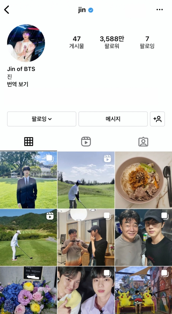 진의 인스타그램은 3588만 팔로워를 돌파하며 세계적으로 사랑받는 글로벌 슈퍼스타로 인플루언서 반열에 올랐다.