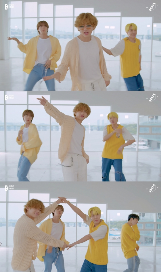 '버터 퍼포먼스 리허설 버전'에서는 일명 '뷔숑(뷔+비숑), '푸들'이라 불리며 화제의 중심에 올랐던 사랑스러운 펌 헤어스타일로 등장해 추억을 소환했다. 올 화이트 티셔츠와 팬츠에 은은한 베이지 컬러의 루즈핏 카디건을 매치해 상큼함을 뽐내며 로맨틱한 남친룩의 정석을 선보였다.