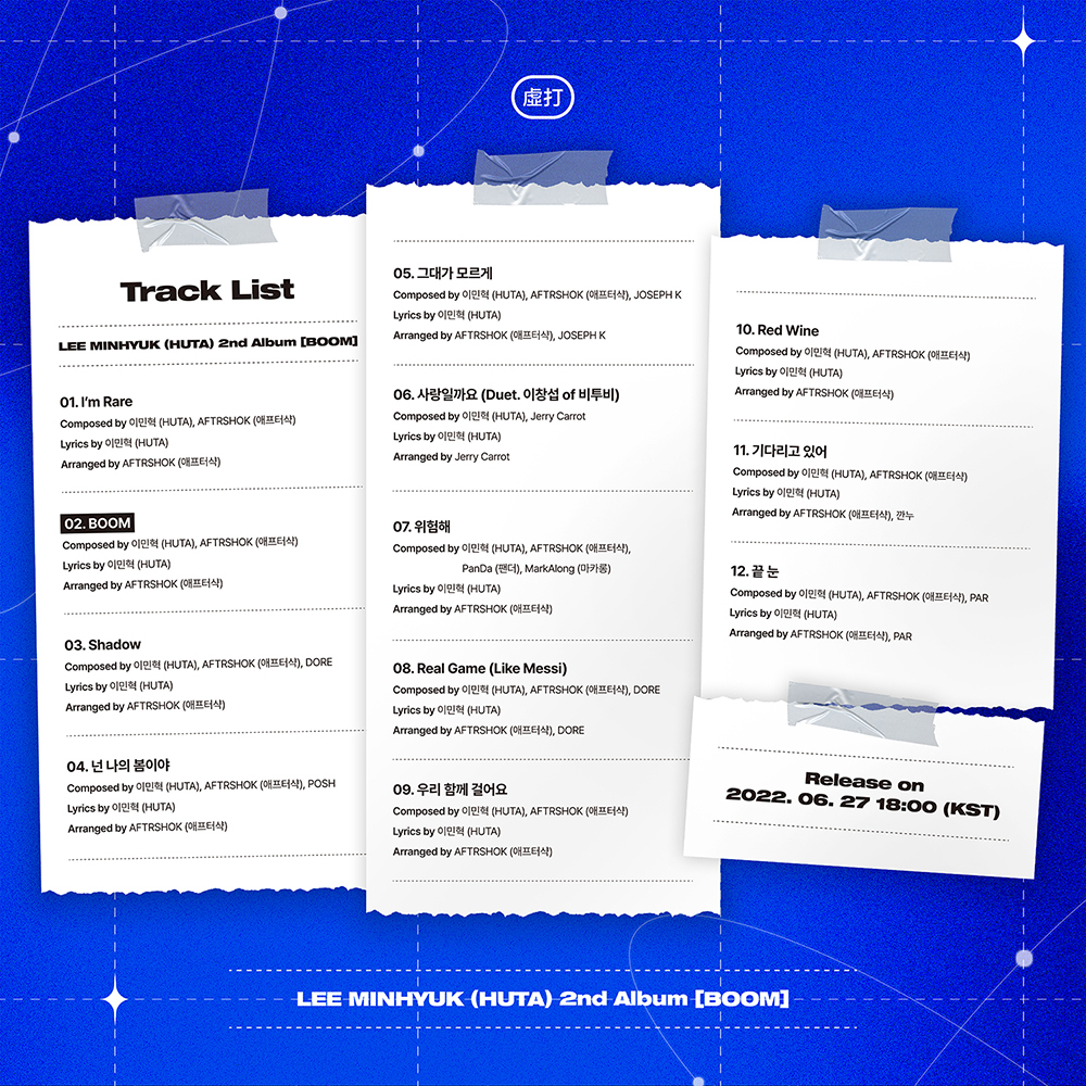 큐브 엔터테인먼트는 13일 0시 비투비의 공식 SNS 채널을 통해 이민혁(HUTA)의 두 번째 정규앨범 'BOOM'의 트랙리스트를 공개했다.