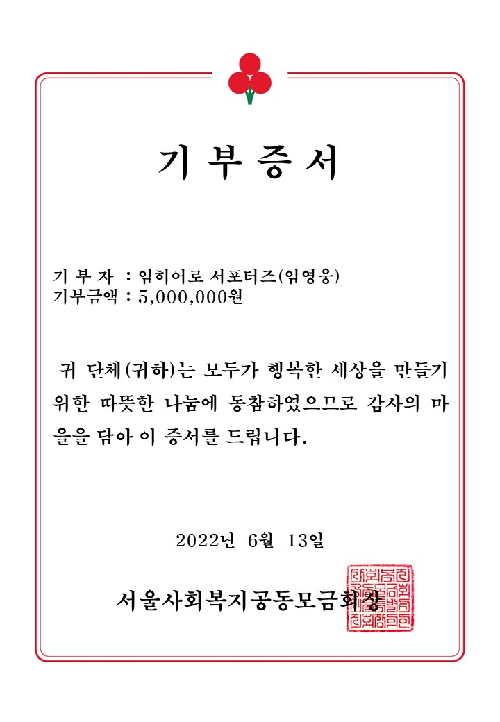 임영웅 팬클럽 임히어로 서포터즈는 서울사회복지공동모금회(회장 윤영석, 이하 서울사랑의열매)을 통해 6월 9일 서울 용산구 사회복지시설 혜심원을 찾아 기부금 500만 원을 전달했다.