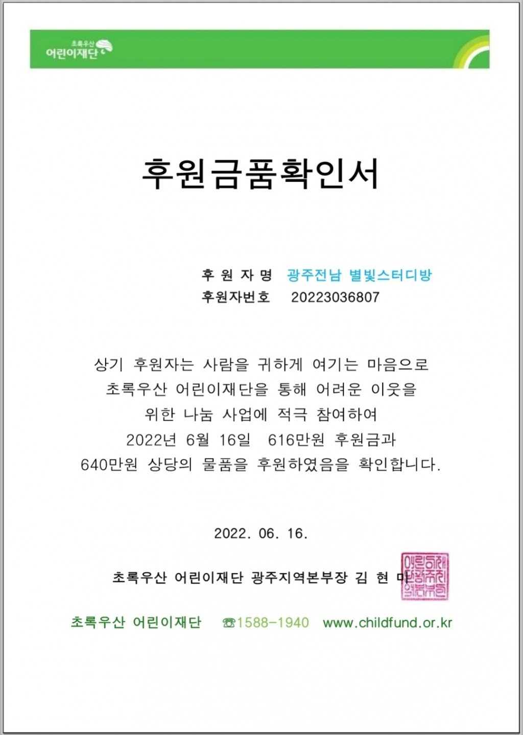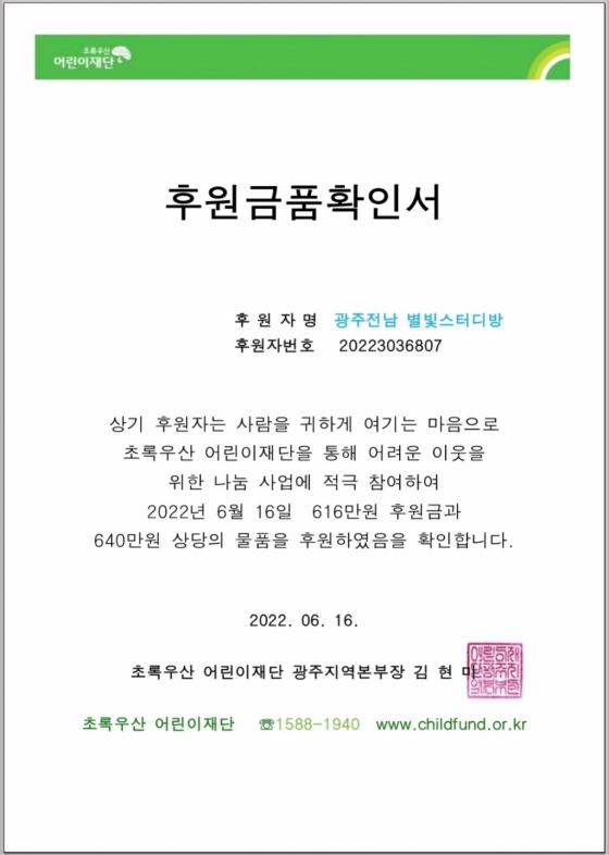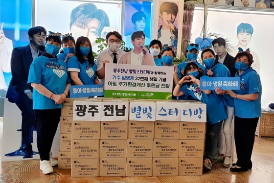 임영웅 팬클럽 '광주전남 별빛스터디방'(방장 백희영)은 6월 16일 광주광역시 서구 치평동 별빛 카페(별빛스터디방)에서 초록우산 어린이재단 광주지역본부(본부장 김현미)에 주거빈곤 아동 주거권 보장 사업 후원금 616만 원과 640만 원 상당 후원 물품을 전달했다.