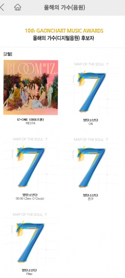 2020년 결산 가온 차트에서 보이 그룹 모든 솔로곡 가운데 1위를 했던 지민의 솔로곡 'Filter'(필터)는 다음해 제10회 가온차트 뮤직어워즈에서 '올해의 가수상 디지털 음원 부문'에서 '2월 음원상' 후보에 지민의 첫 프로듀싱곡 '친구'와 함께 'Filter'가 올라 방탄소년단 4곡중 2곡을 지민이 차지하며 후보중 유일한 솔로곡 기록까지, 대단한 인기를 입증했다.