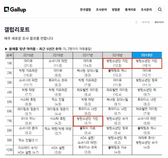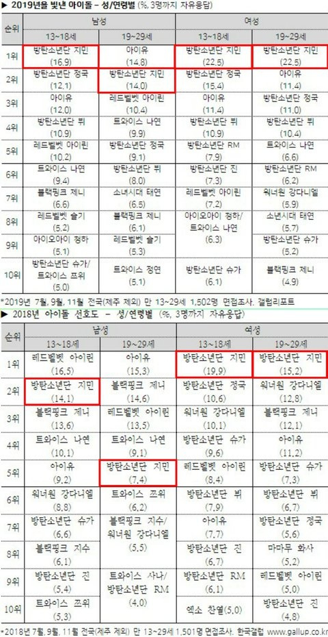 국내 활동이 활발하지 않았음에도 불구하고 유례없는 대중적 인지도와 굳건한 인기로 한국갤럽 '아이돌 개인 선호도'에서 2018년과 2019년 1위에 오른 지민은 남자 아이돌로서 유일한 1위를 차지하며, 한국 갤럽 최초이자 마지막으로 2년 연속 왕좌에 오른 유일한 아이돌로 기록됐다.