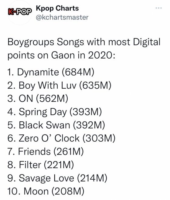 나열이 어려울 정도의 국내 여론 조사에서부터 빅데이터까지 객관적 지표는 물론 팬들의 인기투표까지 항상 최고의 자리를 지키고 있는 지민은 이를 입증하듯 음원 성적에서도 뚜렸한 두각을 나타냈다.