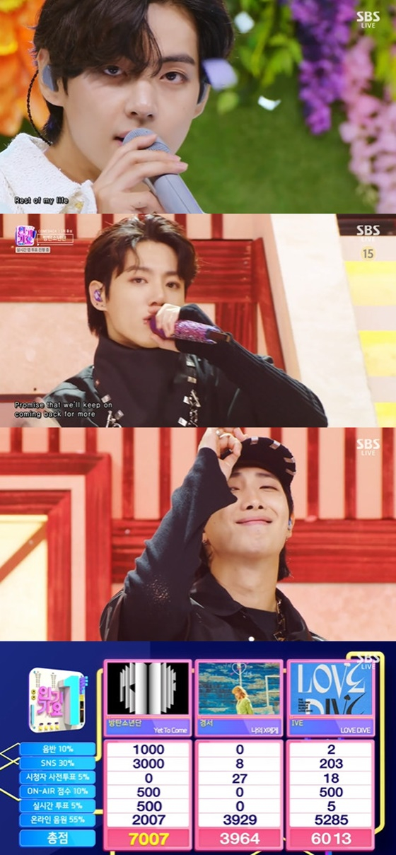 19일 방송된 SBS '인기가요'에서는 방탄소년단의 'Yet To Come'이 경서의 '나의 X에게'와 아이브의 'Love Dive (러브 다이브)'를 꺾고 1위에 올랐다.