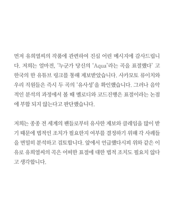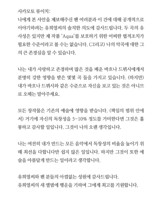 ◆ 유희열 표절 의혹 관련 사카모토 류이치의 입장 전문.