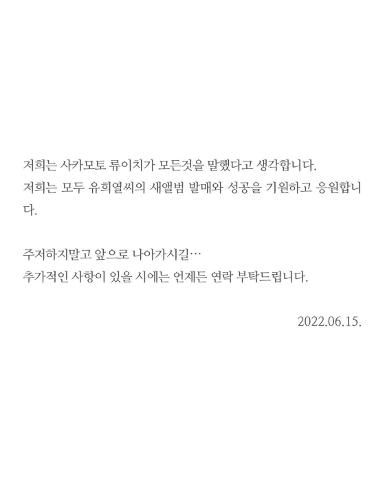 끝으로 "유희열씨와 팬 분들의 아낌없는 성원에 감사드립니다"라며 "유희열씨의 새 앨범에 행운을 기하며 그에게 최고를 기원합니다"고 덧붙였다.