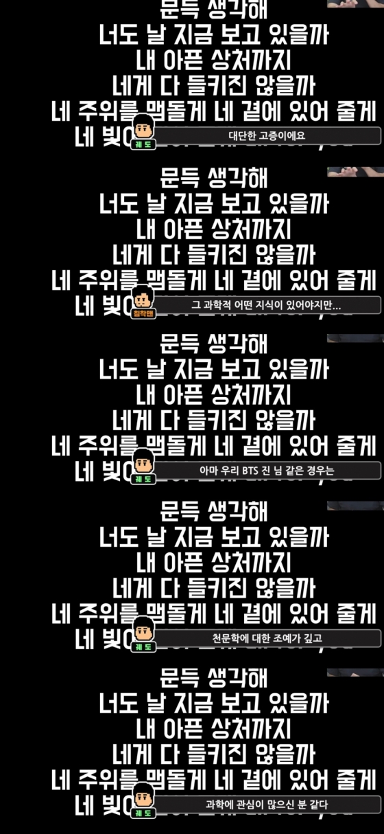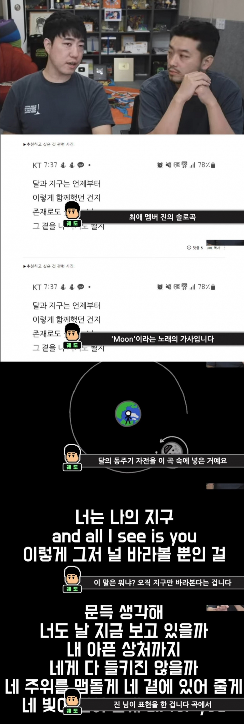 지난 20일 웹툰 작가이자 방송인이기도 한 침착맨(이말년) 유튜브 채널에 과학 커뮤니케이터 궤도가 출연해 진의 'Moon' 가사를 분석했다.